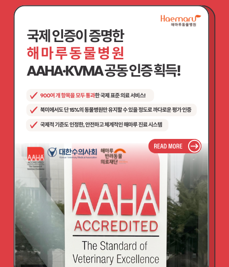 2025-05-29"국제 인증이 증명한 해마루동물병원, AAHA-KVMA 공동 인증 획득!"해마루동물병원이 국내 최초로 시행된 AAHA(미국동물병원협회) - KVMA(대한수의사회) 공동 인증을 획득하였습니다. AAHA는 1933년 설립된, 세계적으로 가장 권위 있는 동물병원 인증 기관으로, 엄격한 기준을 통해 반려동물 의료 서비스의 표준을 이끌어온 단체입니다. 900여 개에 달하는 항목을 모두 통과해야 하는 AAHA 인증은, 북미에서도 단 15%의 동물병원만 유지할 수 있을 정도로 까다로운 평가로 잘 알려져 있습니다. 해마루동물병원은 치밀한 준비 과정을 거쳐 진료 품질, 환자 안전, 의료진 운영, 시설 환경 등 모든 부문에서 국제 기준(Global Standard)을 충족하며 인증을 획득하였습니다. 이번 인증은, 해마루동물병원의 안전하고 체계적인 진료 시스템과 지속 가능한 의료 품질 관리가 국제적으로 공식 인정받은 성과입니다. 앞으로도 해마루는 보호자님과 반려동물을 위해, 최고 수준의 의료 서비스를 제공하고 끊임없이 성장하는 병원이 되겠습니다.