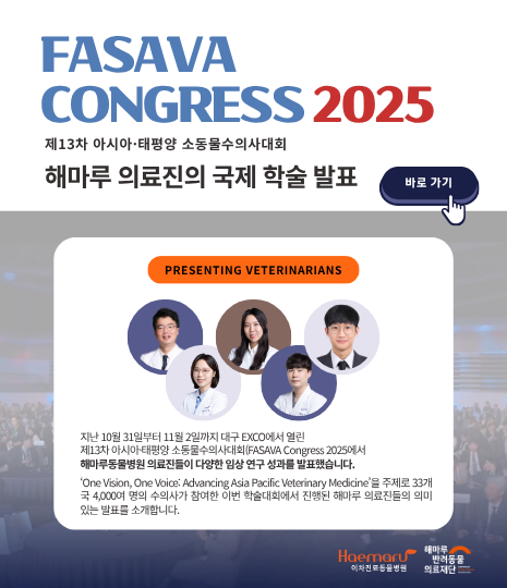 “25년간의 진료 철학, 국제 기준으로 증명되었습니다.”해마루동물병원이 AAHA-KVMA 인증을 획득했습니다!이는 단순한 성과를 넘어, 해마루가 추구해온 의료 철학과 시스템이 국제적 기준에서 인정받았다는 뜻입니다.☞ 김소현 이사장의 진심 어린 메시지를 영상으로 확인해보세요."국제 기준의 진료 품질, 그리고 해마루의 앞으로의 다짐을 전합니다."유튜브 링크 >> https://youtu.be/7Rus3qU3zsk▶ AAHA 인증이란 무엇인가요?AAHA는 북미 지역을 중심으로 1933년부터 운영되어 온, 세계에서 가장 권위 있는 동물병원 평가 기관입니다. 의료 서비스의 질, 환자 안전, 시설 관리, 팀워크, 윤리 기준에 이르기까지 900여 개 항목에 걸쳐 철저한 심사를 거칩니다.해마루는 900여 가지의 기준을 높은 점수로 모두 충족하며, 동물과 보호자를 위한 최상의 진료 환경과 의료 서비스를 제공하는 병원임을 공식적으로 인증받았습니다.▶ 왜 AAHA 인증이 중요한가요?AAHA 인증은 단지 외적인 평가에 그치지 않습니다.환자 중심의 진료, 보호자와의 신뢰, 그리고 의료진의 지속적인 교육과 발전을 통해 지속가능한 의료 가치와 생명 존중의 철학을 실현하는 것이 바로 해마루가 추구하는 길입니다.▶ 해마루가 지향하는 의료 가치우리는 ‘사람과 동물이 함께 건강한 사회’를 목표로,동물병원이 단순히 치료만을 제공하는 공간이 아닌,소통과 회복, 그리고 생명의 가치를 함께 나누는 공간이 되기를 바랍니다. 앞으로도 해마루는 AAHA 인증에 걸맞은 책임감을 가지고,전문성과 진정성을 갖춘 진료로 보호자 여러분의 신뢰에 보답하겠습니다.