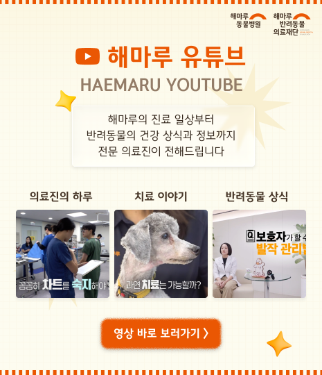 국내최초동물병원 내 상담 센터,반려마음센터가 설립되었습니다. 해마루동물병원은중증·난치질환 및 노령 환자를치료하는 의료기관으로서,치료 과정에서 보호자가 겪는심리적 부담과 상실의 시간을의료의 연장선에서 지속적으로 고민해왔습니다. 반려마음센터는▶ 펫로스 사전 예방 교육▶ 사후 조치 안내▶ 추모 프로그램▶ 심리 상담을체계적으로 운영합니다. 해마루는 그동안 반려동물의 생명을 치료해왔습니다.이제는 그 시간을 함께 견뎌온보호자의 마음까지 함께 살피고자 합니다. "치료의 전문성에 더해보호자의 마음까지 함께하겠습니다."해마루반려마음센터이제 시작합니다.■ 반려마음센터 프로그램 보기