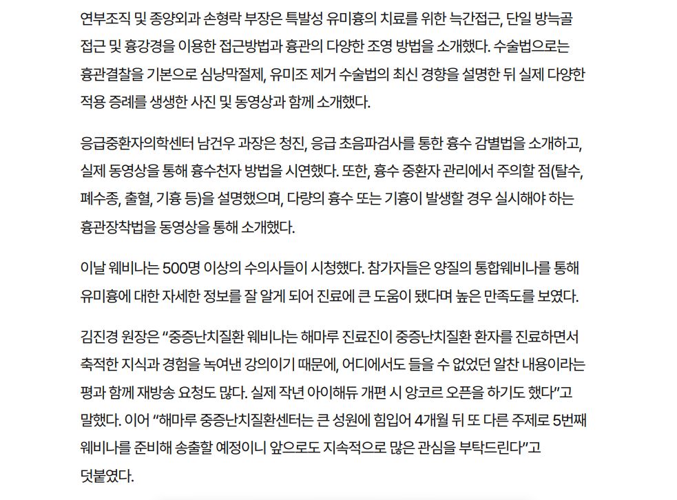 ▶ 출처 | 데일리벳 ◀ 목록 PREV [소식] 해마루 중증난치질환 시리즈 제 4탄, 유미흉 웨비나 성료! NEXT [학술활동] 이가현 영상의학과 부장, 대한공중방역수의사협회 세미나에서 <위장관 질환의 영상 검사> 강의