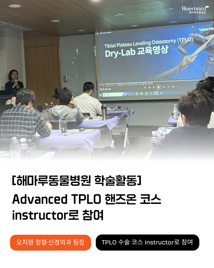 해마루 정형·신경외과 오지원 팀장이 최근 TPLO 수술 코스의 Instructor로 참여했습니다. 이번 코스는 강아지 파행의 대표적인 질환인 전십자인대 질환의 치료법인 TPLO 수술법에 대한 실습 워크숍이었습니다.